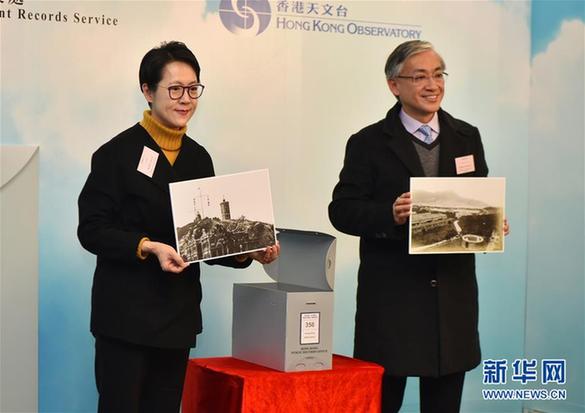 ↑2月5日,香港特区政府行政署长蔡洁如(左)和香港天文台台长岑智明在仪式上展示旧照片。当日,由香港特区政府档案处和香港天文台合办的“百年风云:档案里的天文台故事”展览在香港历史档案大楼举行开幕仪式。展览通过40多件藏品,多角度展示香港天文台成立初期和当时的运作情况。新华社发 (王玺 摄)