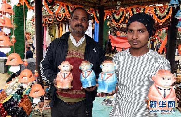 ↑2月6日,在印度哈里亚纳邦,两名男子展示陶瓷制品。第32届印度国际手工艺制品展览会于2月2日至18日在印度哈里亚纳邦举行,来自印度、土耳其、叙利亚、南非等国的手工艺人集中展示了木器、陶器、纺织品和皮革等手工艺制品。新华社记者 张迺杰 摄