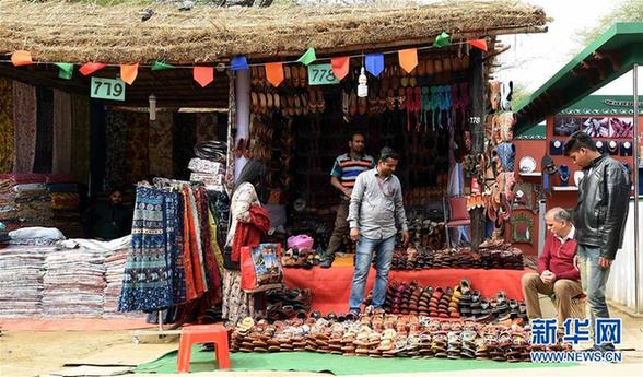 ↑2月6日,在印度哈里亚纳邦,手工艺人展示特色鞋子。第32届印度国际手工艺制品展览会于2月2日至18日在印度哈里亚纳邦举行,来自印度、土耳其、叙利亚、南非等国的手工艺人集中展示了木器、陶器、纺织品和皮革等手工艺制品。新华社记者 张迺杰 摄