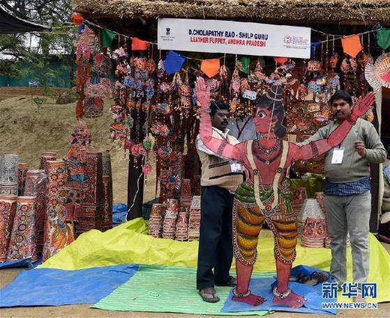 ↑2月6日,在印度哈里亚纳邦,两名手工艺人展示皮影。第32届印度国际手工艺制品展览会于2月2日至18日在印度哈里亚纳邦举行,来自印度、土耳其、叙利亚、南非等国的手工艺人集中展示了木器、陶器、纺织品和皮革等手工艺制品。新华社记者 张迺杰 摄