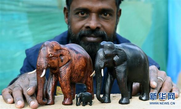↑2月6日,在印度哈里亚纳邦,一名男子展示木雕象。第32届印度国际手工艺制品展览会于2月2日至18日在印度哈里亚纳邦举行,来自印度、土耳其、叙利亚、南非等国的手工艺人集中展示了木器、陶器、纺织品和皮革等手工艺制品。新华社记者 张迺杰 摄